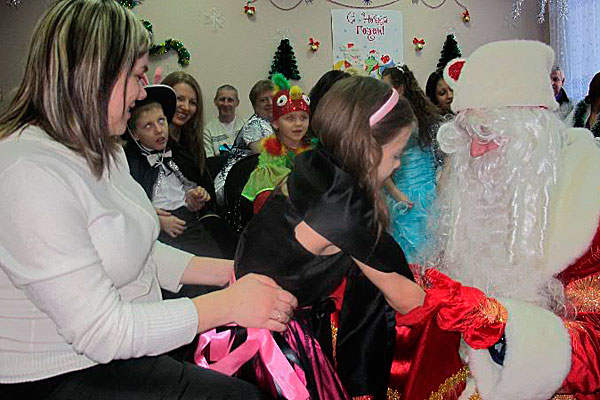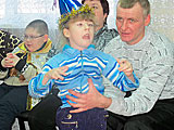 Каждый ребенок прочел стихотворение или спел песенку. Правда, некоторые малыши так разволновались, что не смогли произнести ни слова, так что на помощь пришлось приходить родителям. Но, как бы то ни было, силы самостоятельно достать из мешка Деда Мороза новогодний подарок нашлись у всех. И пусть некоторым вновь пришлось прибегнуть к помощи мам и пап (не всем под силу даже самые простые движения), счастье переполняло каждого.